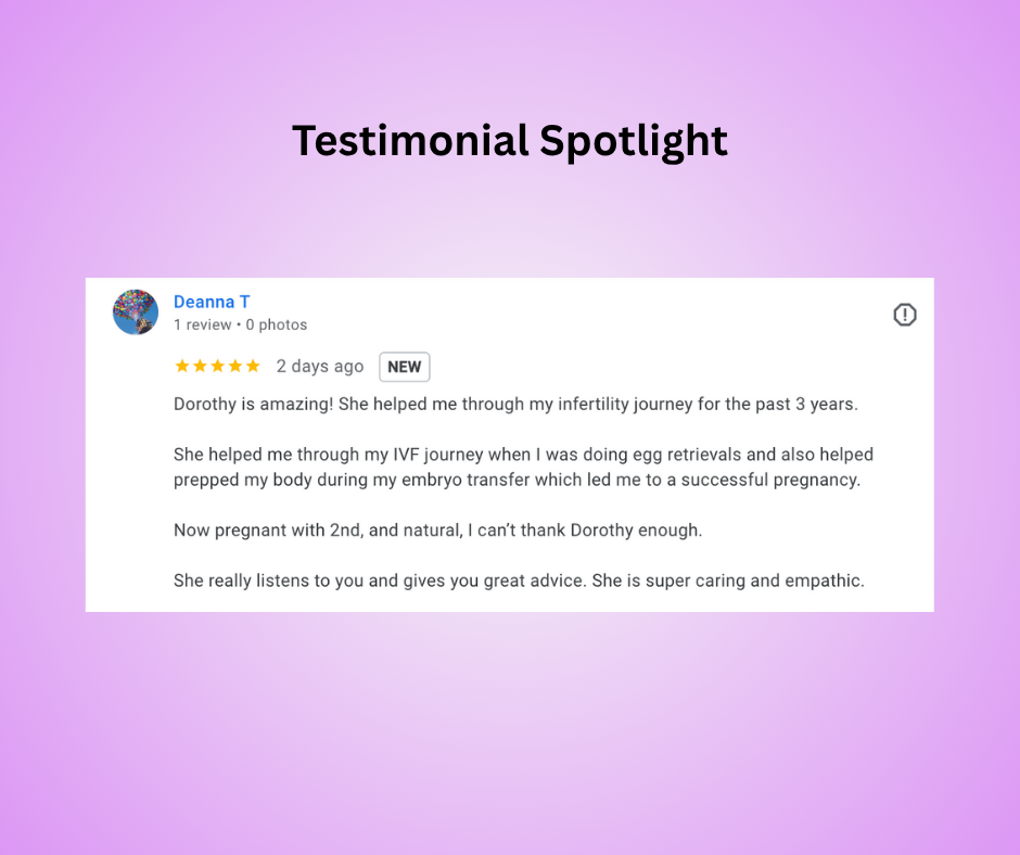 For women who are interested in increasing their chances of pregnancy to 85%, Dorothy has the Dragon Egg Program. This program involves weekly fertility coaching in addition to acupuncture, to maximize your fertility. It’s personalized to help you learn how to best take care of your particular body. Video chat Fertility Coaching is also available in lieu of in person office visits for those that are not local. Improved results are Guaranteed if you are doing your second or later IVF cycle.